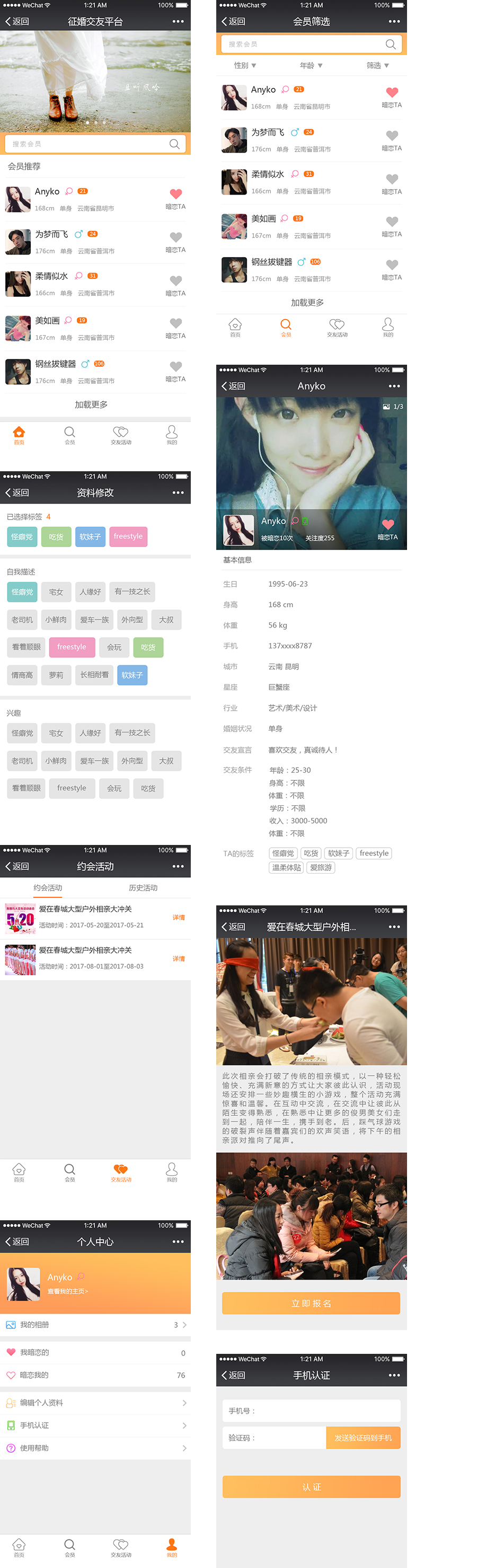 主要功能包括:會(huì )員交友信息展示,會(huì )員相冊,會(huì )員認證,相親活動(dòng),資料管理等等!